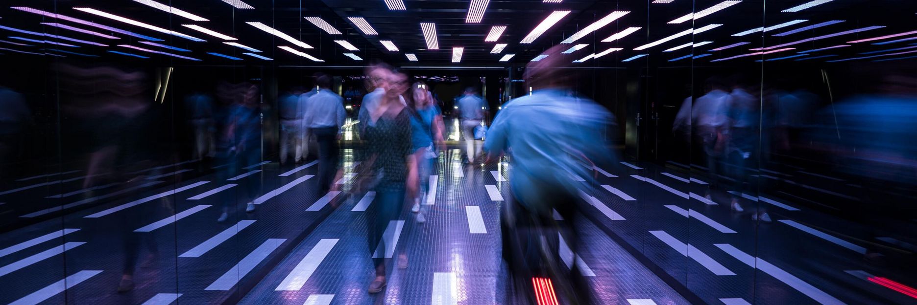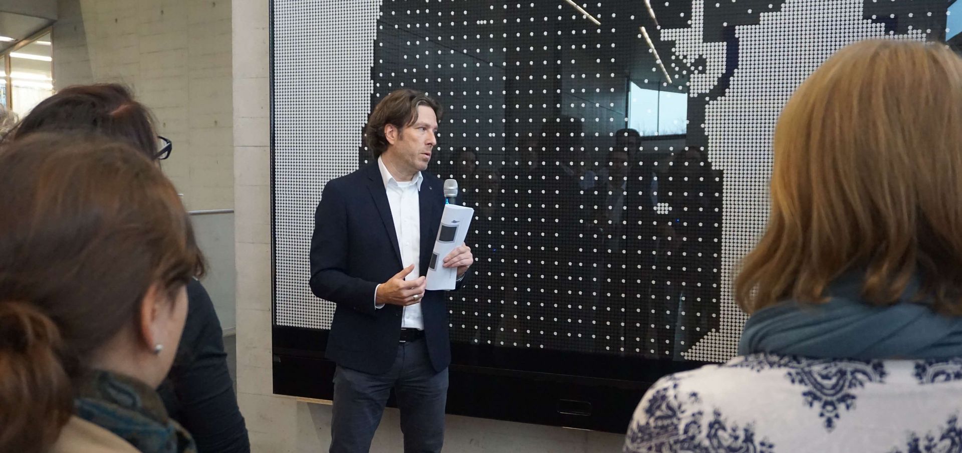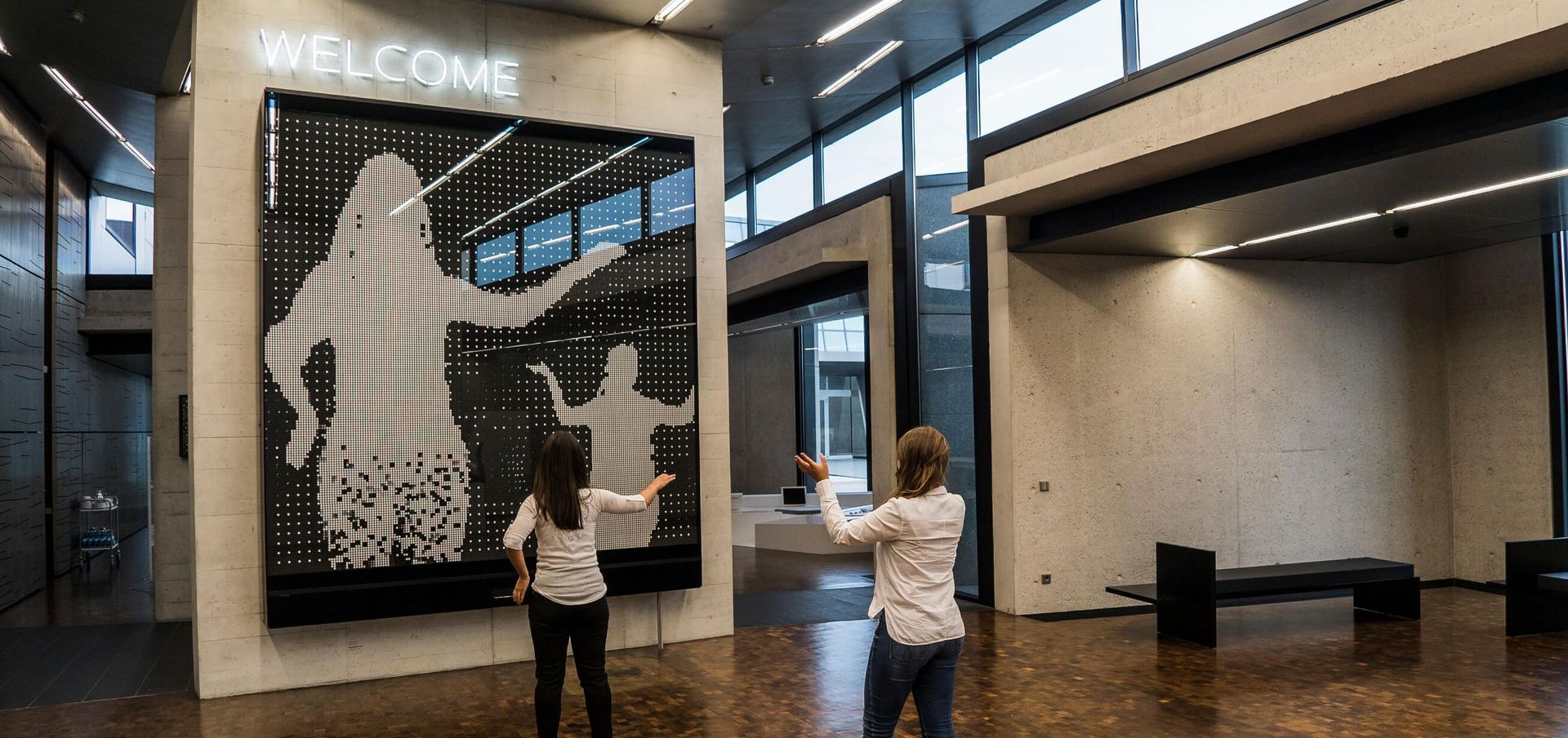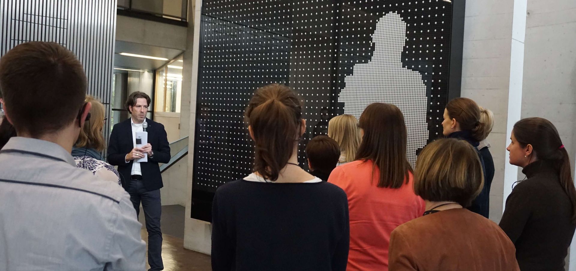 At the end of his presentation, Daniel Schweiger takes up position next to the elevator and the stairway from the tunnel to the machine demonstration center – the final section of the new Welcome Passage – and answers any remaining questions the participants might have. It’s almost exactly quarter past twelve. “Interacting with the artists helps give us a better understanding of the artworks we see at work on a daily basis,” says Laura Kremer on the way back to the flip-disc display, which marks the tour’s start and finish point.