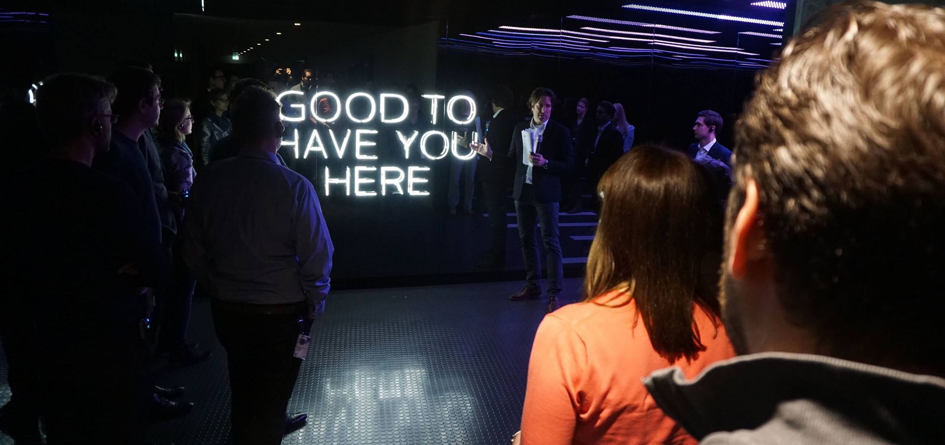 Daniel Schweiger is an architect at TRUMPF. Together with Joachim Silber, the head of brand and marketing communication, and the agency Schmidhuber, he helped bring about the latest work of art to grace the campus in Ditzingen – the “Welcome Passage” for customers and partners. As well as the flip-disc display on the wall, this also encompasses the words “Good to have you here” which greet visitors on their way between the lobby and the machine demonstration center in TRUMPF’s specially designed tunnel system. “That neon writing is a real work of art, it was hand-made exclusively for us,” says Schweiger enthusiastically. Electrodes excite the gas in the tubes that form the words, making it light up.