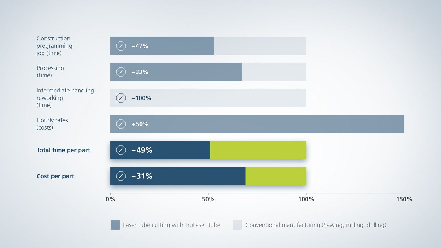 49% din timp și 31% din costurile unei piese – iată cât de mult economisiți la piesa noastră de exemplu cu o îmbinare articulată prin debitarea cu laser a țevilor. În același timp, vă simplificați procesele și organizarea. În comparație cu debitarea, găurirea și frezarea convenționale, reduceți, de asemenea, etapele de lucru din aval, cum ar fi debavurarea, sudarea sau montarea. Puteți să tăiați contururi complexe, să introduceți filete și să tăiați țevi la lungime într-o singură etapă de lucru.