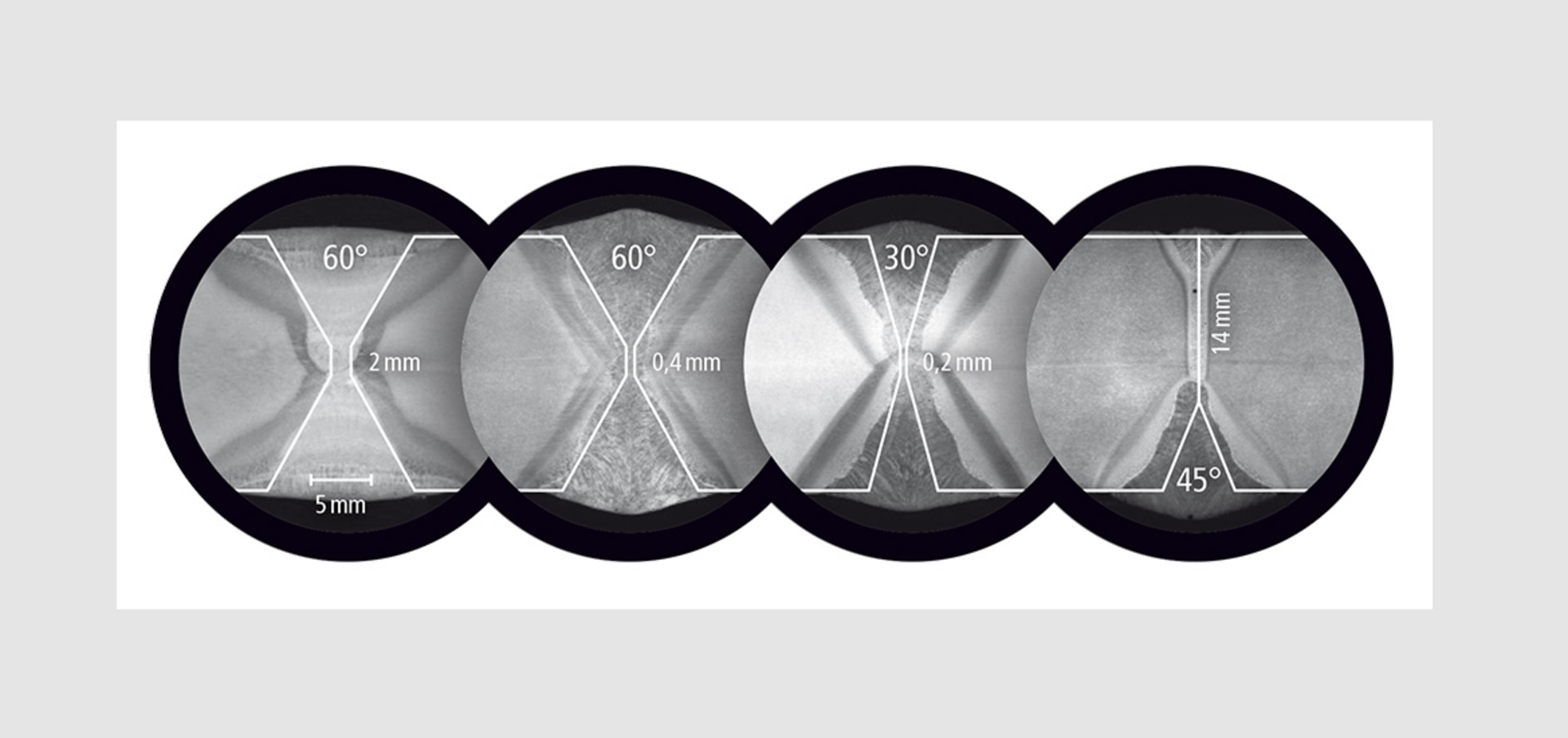 Figure 2 shows the microsections and joint preparations of the welded sheets, which are characterized by the groove angle, the gap, and the face.