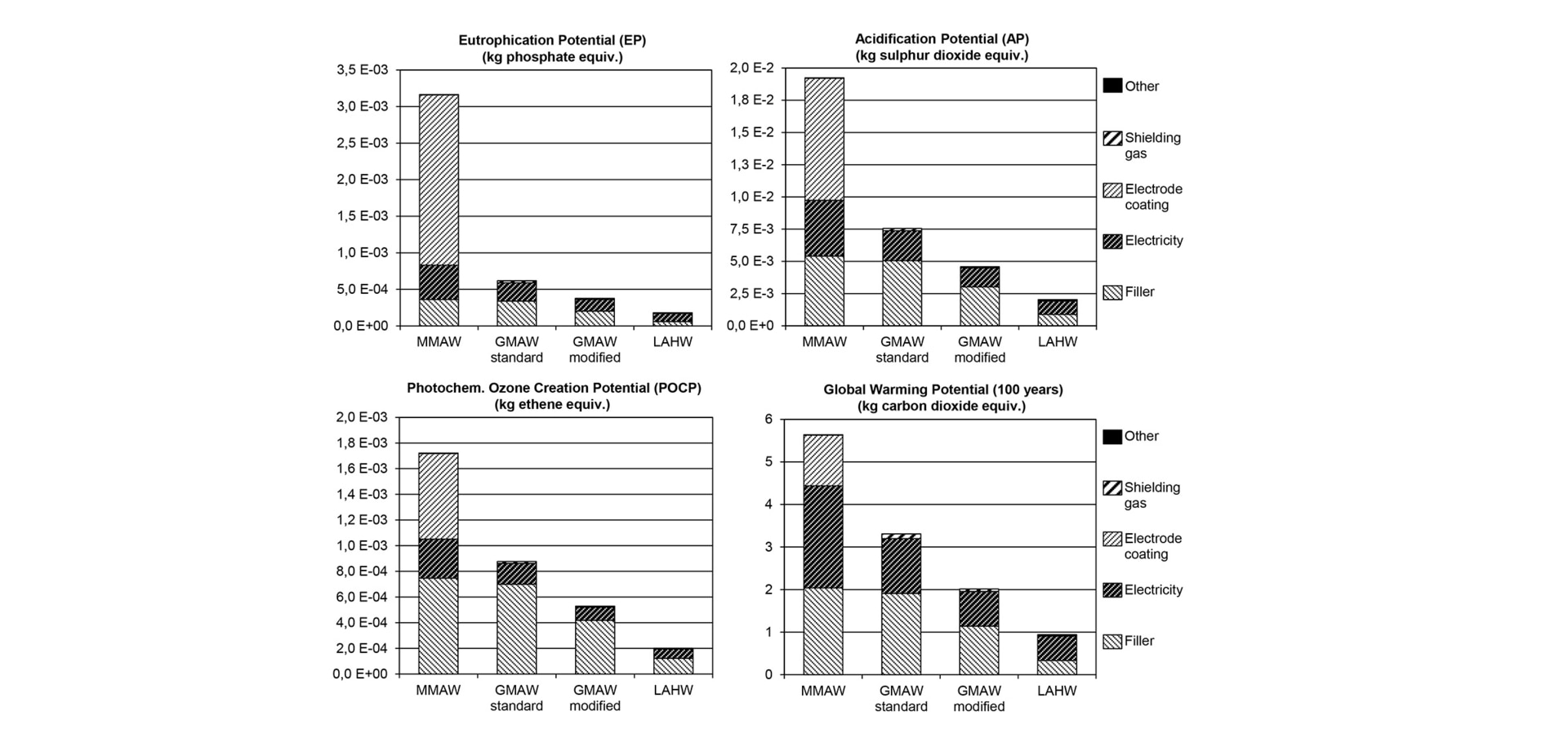 In the EP (eutrophication potential) and AP (acidification potential) impact categories, different inputs are dominant depending on the technique used. For example, rutile coating has the biggest effect on EP and AP in the case of MMAW; the filler material has the biggest effect in the case of GMAW; and power consumption has the biggest effect in the case of LAHW. In the POCP (photochemical ozone creation potential) category, the filler material is the dominant influence for all welding methods.