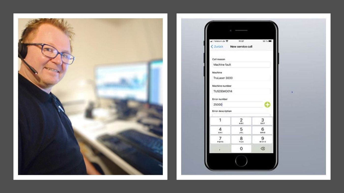 Serviceärenden rapporteras och hanteras online direkt i MyTRUMPF eller ännu enklare via appen. ”Man kan alltså välja här, säger Andreas men telefonen är ju oftast det man har med sig ute vid maskinen och därmed är det väldigt smidigt att hantera ärendena via appen direkt.” Mycket effektivt är att man kan bifoga bilder till sitt ärende och då underlättar det ju mycket att kunna ta fotot enkelt med sin telefon och få in det i serviceärendet direkt. "Kommunikationen med serviceavdelningen sker direkt i appen i stället för email, vilket också förespråkar appen,” tillägger Hans-Olof Vilhelmsson, Inhouse servicetekniker på TRUMPF. Har till exempel maskinoperatören endast tillgång till sin mail i datorn på kontoret vilket är vanligt förekommande så tar det onödig tid".