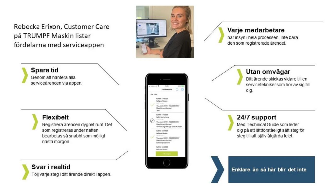 Det är inte en slump att vår serviceapp vunnit flera priser där den primärt hyllas för sin användarvänlighet och att den på ett optimalt sätt möter behoven hos våra kunder. "Den är utformad så att man bara några enkla steg kan registrera ett serviceärende eller ställa en fråga. I stället för att behöva ringa vår kundsupport och ha exempelvis maskinnummer och felkoder till hands," berättar Rebecka Erixon, Customer care på TRUMPF Maskin. "Det sparar mycket tid men det bästa är nog att man som kund sedan kan följa sitt ärende - man ser så fort vi har tagit emot och börjat jobba på det." Rebecka har under en tid tillbaka hållt flertalet demonstrationer av appen för TRUMPFkunder. "Den är väldigt självförklarande i sig och enkel att förstå och jag upplever att kunderna blir mycket positivt överraskade av de fördelar den har" säger Rebecka.