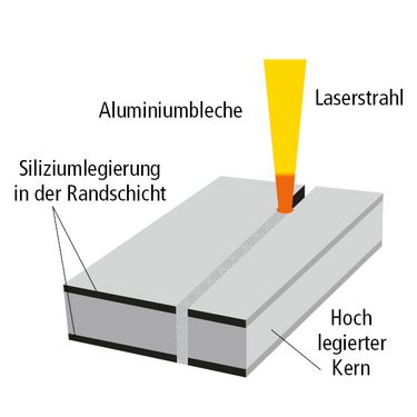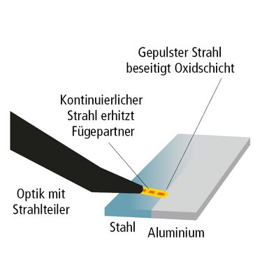 Klassisch mit einer metallurgischen Verbindung schweißen lassen sich Stahl und Aluminium nicht. Per Laser lässt sich dennoch eine stabile Überlappverbindung herstellen. Dabei schmilzt der Laser den Stahl im Fokus auf und die Schmelze erhitzt das darunterliegende Aluminium. Beim Erstarren haftet der Stahl in einer dem Löten verwandten Verbindung auf dem Aluminium.