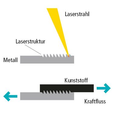 Wieder hilft der Laser in zwei Rollen: Als „Haftvermittler“ strukturieren Hochleistungsnanosekundenlaser auch große Haftflächen vor — etwa mit Hinterschnitten, erzeugt durch Materialaufwurf —, ehe das Bauteil umgossen oder ein Thermoplast angespritzt wird. Und als Fügewerkzeug kann Laserlicht den metallischen Fügepartner direkt oder im Durchstrahlverfahren entlang der Naht erhitzen, sodass der Kunststoffpartner dort schmilzt und haftet.